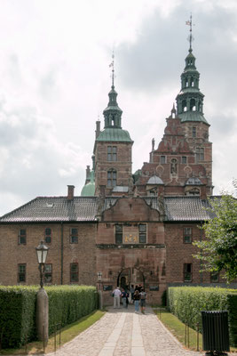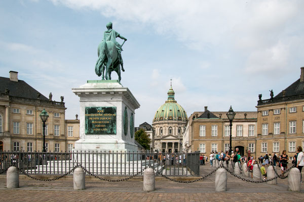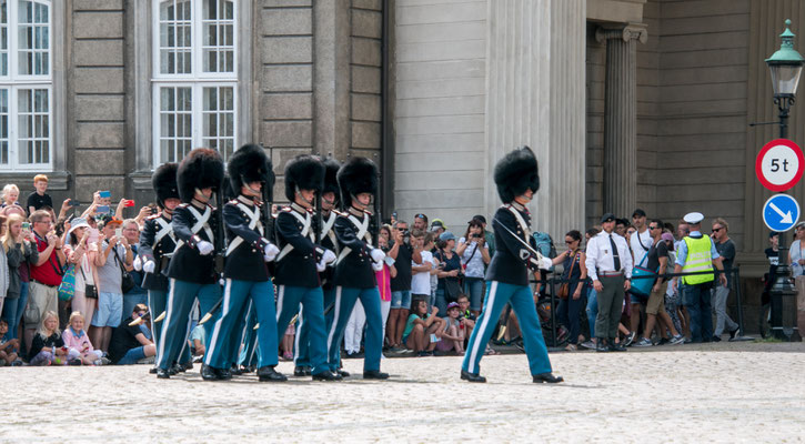 Nun rüber über die Straße in den Garten von Rosenborg Slot. Da wir unbedingt die Wachablöse sehen wollen, beeilen wir uns zum Schloss Amalienburg zu kommen. Das Schlossensemble wird durch vier einzelne Palais um einen achteckigen Platz gebildet. An diesem Tage findet nur eine „kleine“ Wachablöse (Palastwachablösung ) durch die königliche Leibgarde statt, also ohne Musik und Fahne und mit einer kleineren Wachmannschaft. Die Leute drängen trotzdem auf den Platz, es ist kaum ein Durchkommen, natürlich sind auch Kreuzfahrtsschiffs-Touristen in Scharen auf dem Platz.