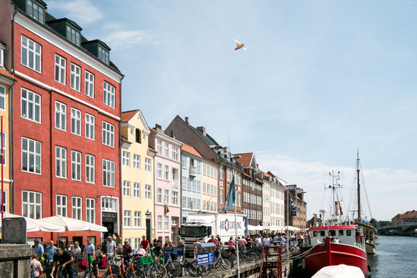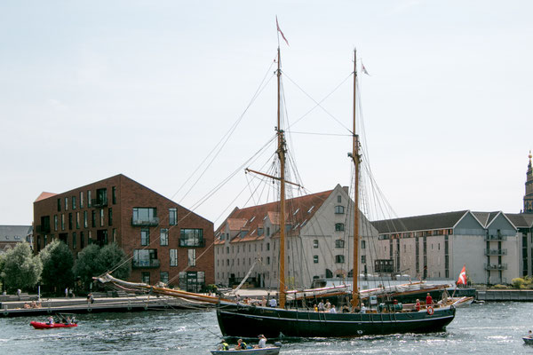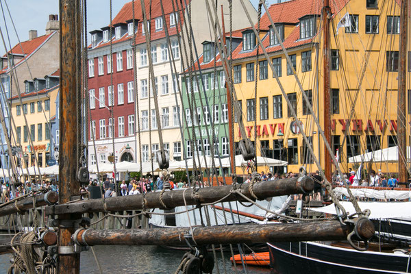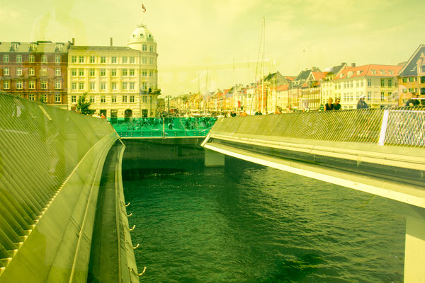 Wir schauen, dass wir aus dem Tumult entkommen und gehen nun am Amalienkai entlang, bewundern das neue Opernhaus und die Maersk-Zentrale mit seinen „blauen“ Fenstern. Vorbei am Schauspielhaus geht es zum Nyhavn. Die Fahrrad und Fußgängerbrücke wird gerade aufgemacht, als wir rübergehen wollen, weil ein 3-Master-Segelschiff aus dem Hafen ausläuft. Die Brücke ist eine einmalige Konstruktion, hier werden die Fahrbahnen eingezogen, damit entsteht eine Durchfahrtlücke für größere Schiffe.