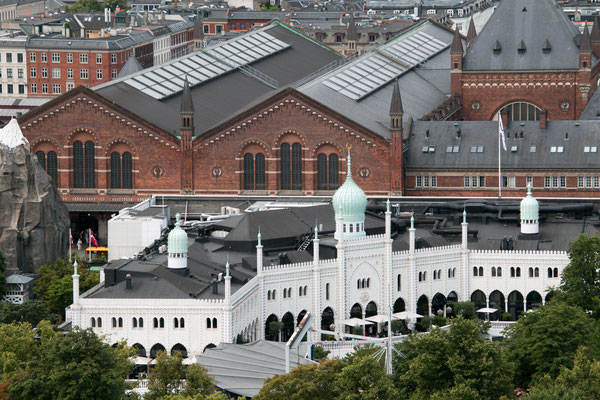 Danach laufen wir Richtung Tivoli Haupteingang, dann zum Hauptbahnhof, dem gegenüber ein deutscher Biergarten ist. Den haben wir aber nicht besucht, sondern schlendern weiter zum Axel Tower, der aus einem Gebäude mit fünf aneinander gruppierten runden Türmen unterschiedlicher Höhe besteht.