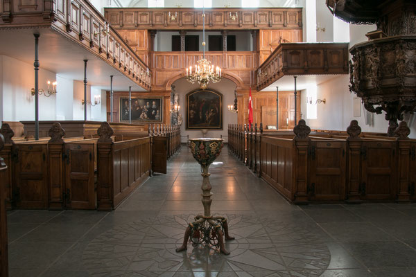 Nun marschieren wir zur Vor Frelsers Kirk. Der auffälliger Turm ist in der gesamten Stadt sichtbar. Den Turm kann man von außen auf der spiralförmigen Treppe besteigen. Das Kircheninnere ist eher schlicht aber trotzdem sehenswert.